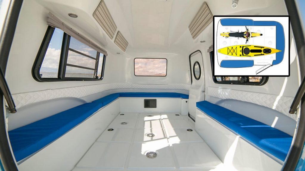 Los módulos que se adhieren al interior de la camioneta son cubos construidos con un plástico doblado duradero que les permite encajar de forma segura. Luego, se pueden agregar una variedad de cosas diferentes para transformar el propósito del cubo, como cojines, tableros de mesa, encimeras, tapas y puertas de primera calidad, todos los cuales están hechos de un material llamado Lite-Ply, que es 55% más ligero que el contrachapado normal.
