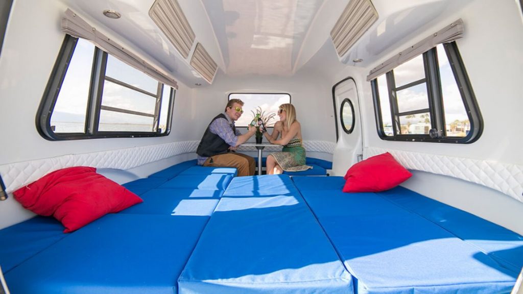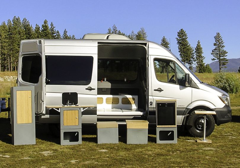 Happier Camper ofrece una amplia gama de componentes disponibles para personalizar el espacio habitable, desde cojines hasta bancos, encimeras de madera y mesas anidadas. Puede agregar una nevera portátil y un cubo de cocina con un fregadero con bomba eléctrica para crear una cocina o mejorar con la opción de cocina de lujo que tiene un refrigerador extraíble y una estufa, así como el fregadero.